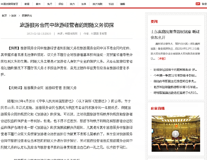 随着2013年4月25日《中华人民共和国旅游法》(以下简称《旅游法》)的公布,并于同年10月1日正式实施,旅游服务合同也就成为我国有名合同家族中的一名新成员。伴随旅游服务合同的规范化和《旅游法》的实施,可以说,这对我国旅游市场秩序的规范和旅游者合法权益的保护是一种利好。但是,也不得不注意到,旅游市场秩序的规范和旅游者合法权益的保护也绝非是一部《旅游法》的实施就能解决问题的,尤其是对其中旅游服务中旅游经营者不履行合同义务损害旅游者合法权益的行为就更不是那么简单的了。本文仅对旅游服务合同中旅游经营者应当承担的附随义务进行初步探讨,并对旅游经营者违反旅游服务合同中附随义务的认定以及应当向旅游者承担的法律责任提出自己的一孔之见,以求教于同仁。