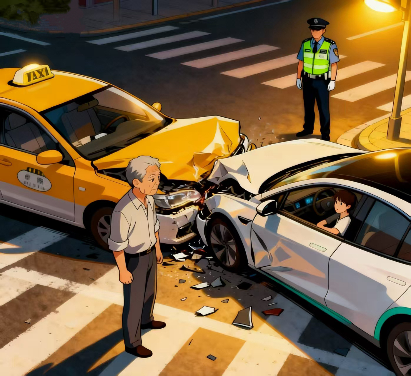 出租车司机老张在某路口撞上小陈驾驶的轿车,小陈受伤,车辆损坏。交警认定老张负事故全部责任。