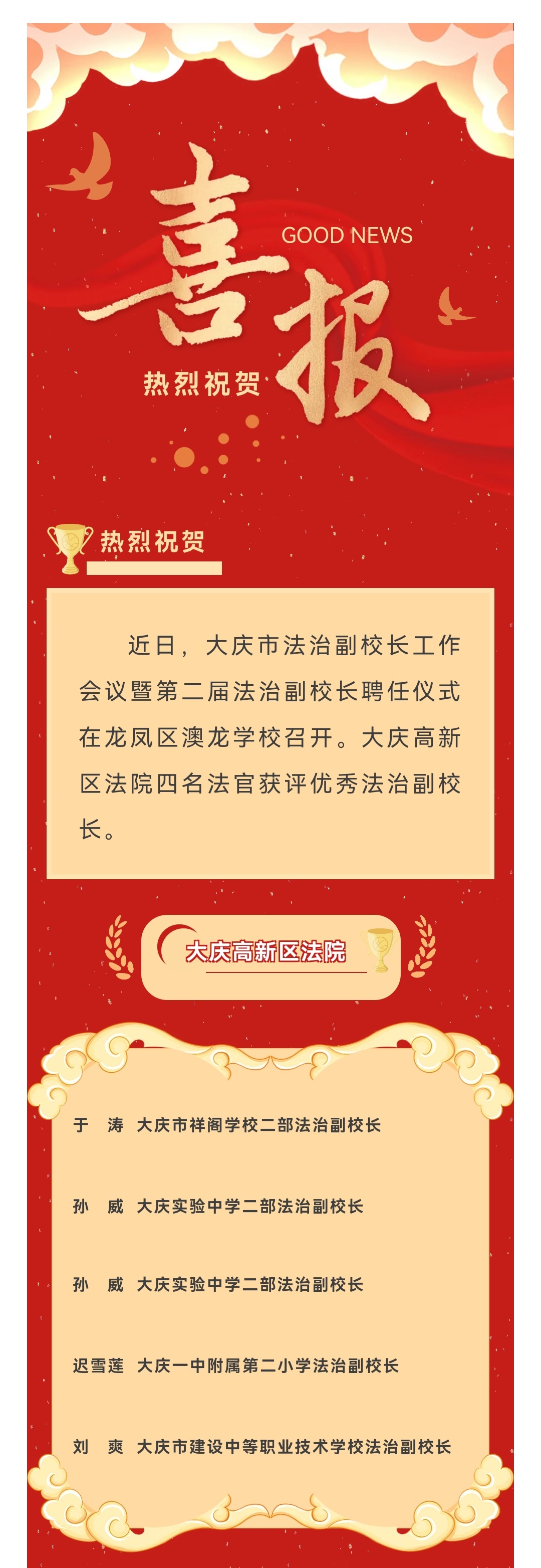 “三争”晋先|大庆高新区法院四名法官获评优秀法治副校长