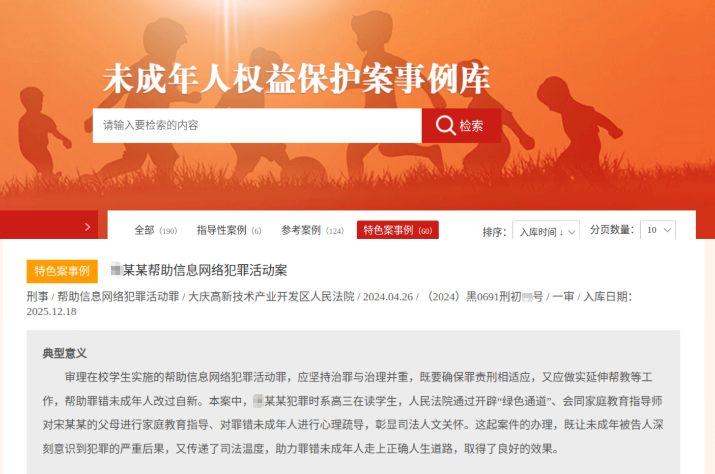 近日,大庆高新区法院刑庭副庭长于涛审理并编报的一起未成年人帮助信息网络犯罪活动罪案例,成功入选最高法院“人民法院未成年人权益保护特色案事例库”,为同类案件的裁判提供了有益借鉴和实践参考。