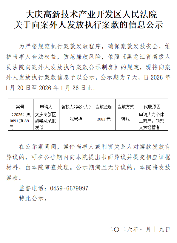 大庆高新技术产业开发区人民法院关于向案外人发放执行案款的信息公示