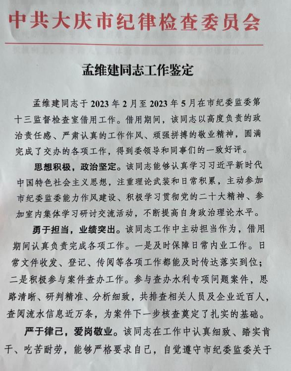 孟维建讲政治、守纪律、懂规矩,坚决响应组织号召、服从工作安排。多年来,他先后多次被抽调配合市委政法委、市纪委开展专项工作,不讲条件、不打折扣,第一时间奔赴新岗位,快速适应新环境、学习新业务、融入新团队。专项工作任务重、要求高、纪律严,他始终保持严谨认真的工作态度,无论是案件核查、综合协调,还是材料撰写、日常保障,都一丝不苟、全力以赴,严守工作纪律和保密规定,高标准完成每一项交办任务。此间,他踏实肯干的作风、扎实过硬的能力、认真负责的态度,给上级领导和同事留下深刻印象,得到一致好评,也充分展现了法院干警顾全大局、能打硬仗、甘于奉献的良好形象。