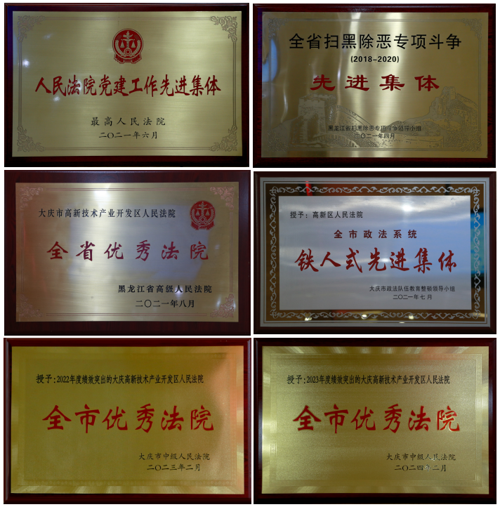大庆高新技术产业开发区人民法院组建于2007年3月,同年12月正式挂牌受案,年均受案8000件左右,内设立案庭、刑庭、民庭、行政庭、执行局、政治部、审管办、办公室、法警大队等9个部门,派出法庭和诉讼服务站各1个;现有干警206人(政法专项编制干警85人、聘任制干警121人),包括员额法官45人、中共党员77人,在编干警全部达到本科学历、硕士以上学位占比21.2%,另有人民陪审员156人,逐步健全完善了以审判为中心的法院工作格局。 多年来,高新区法院坚持以习近平新时代中国特色社会主义思想为指导,深学笃信践行习近平法治思想,认真学习贯彻党的二十大及二十届历次全会精神,聚焦“努力让人民群众在每一个司法案件中感受到公平正义”目标,紧扣“公正与效率”主题,对照党中央决策部署和省市委、上级法院工作要求,持续深化思想认识、狠抓工作落实,忠实履行宪法法律赋予的神圣职责,不断满足人民群众的新需求新期待,加快推进审判工作现代化,努力以实干实绩实效支撑和服务中国式现代化大庆新实践。 初心如磐,使命在肩,唯奋斗以致远。多年来,高新区法院人始终保持“唯旗必夺、唯先必争”的信念和气魄,坚持因院作为、特色发展,善作善成、久久为功,在持续争先创优中提振队伍干事创业的精气神,先后获得人民法院党建工作先进集体、全国维护青少年权益岗创建单位、全国“三八”红旗集体、全国刑事审判先进集体、全国优秀法院、全省扫黑除恶专项斗争先进集体、全省知识产权保护工作成绩突出集体、全省政法系统先进集体、全省优秀法院、全市“铁人式”先进集体等荣誉200余项,荣立集体一等功、二等功各一次。 “厚德尚法、秉正守廉、惟民致新、重效笃行”,这正是高新区法院的真实写照。高新区法院人用担当作为、创业创新的声声脚步,让庄严的法徽在团结奋进中熠熠生辉……